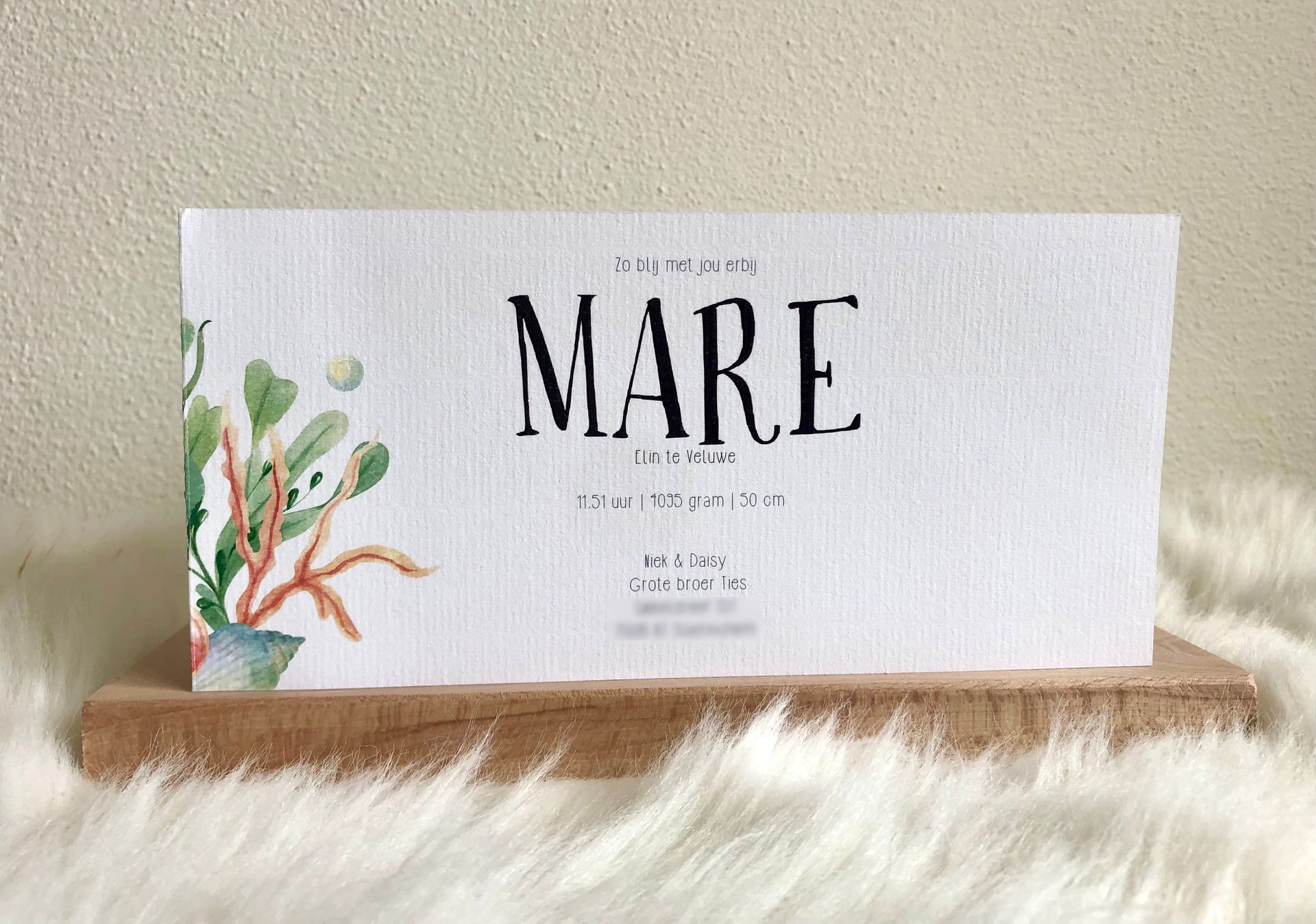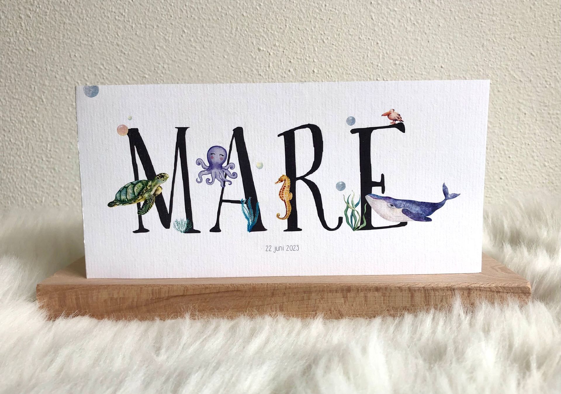 Dit is een prachtige variant op het geboortekaartje van Ties, de grote broer van Mare. Mare betekent 'zee' in het Italiaans. Je ziet een zee vol met leuke dieren en figuren in watercolor. Het geboortekaartje lijkt nu echt een greep uit de oceaan.