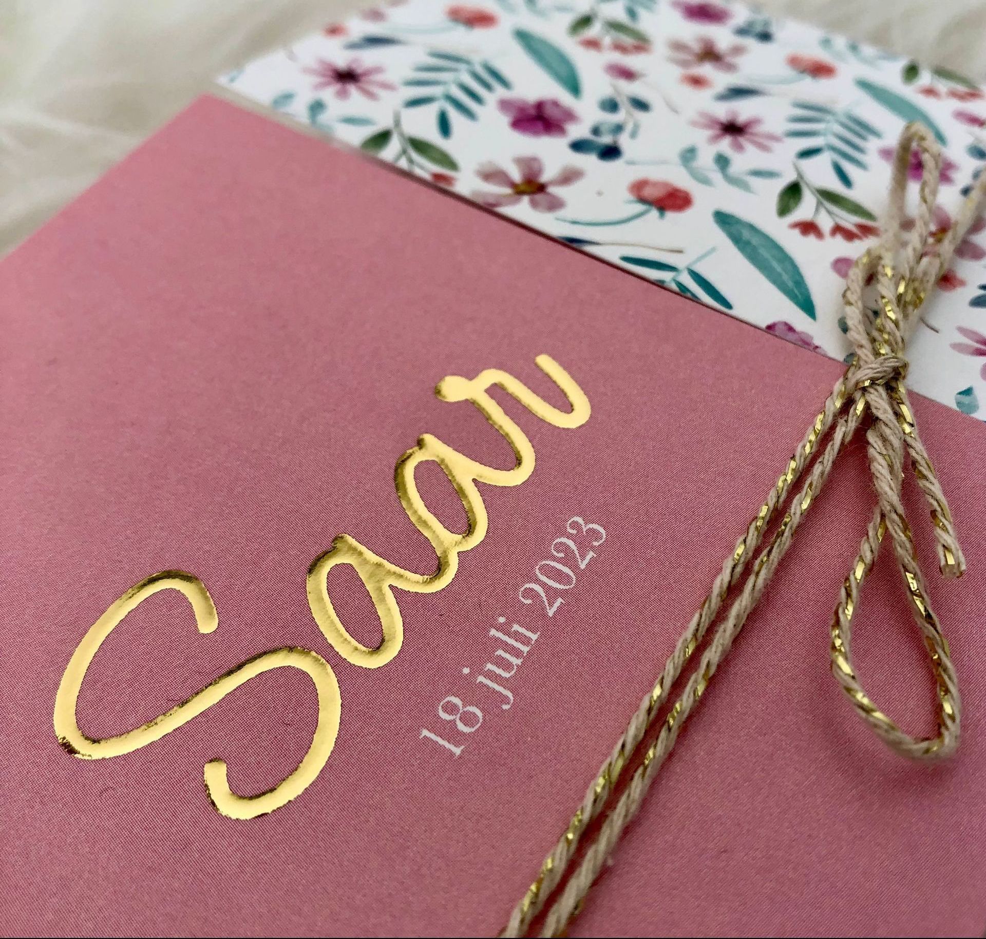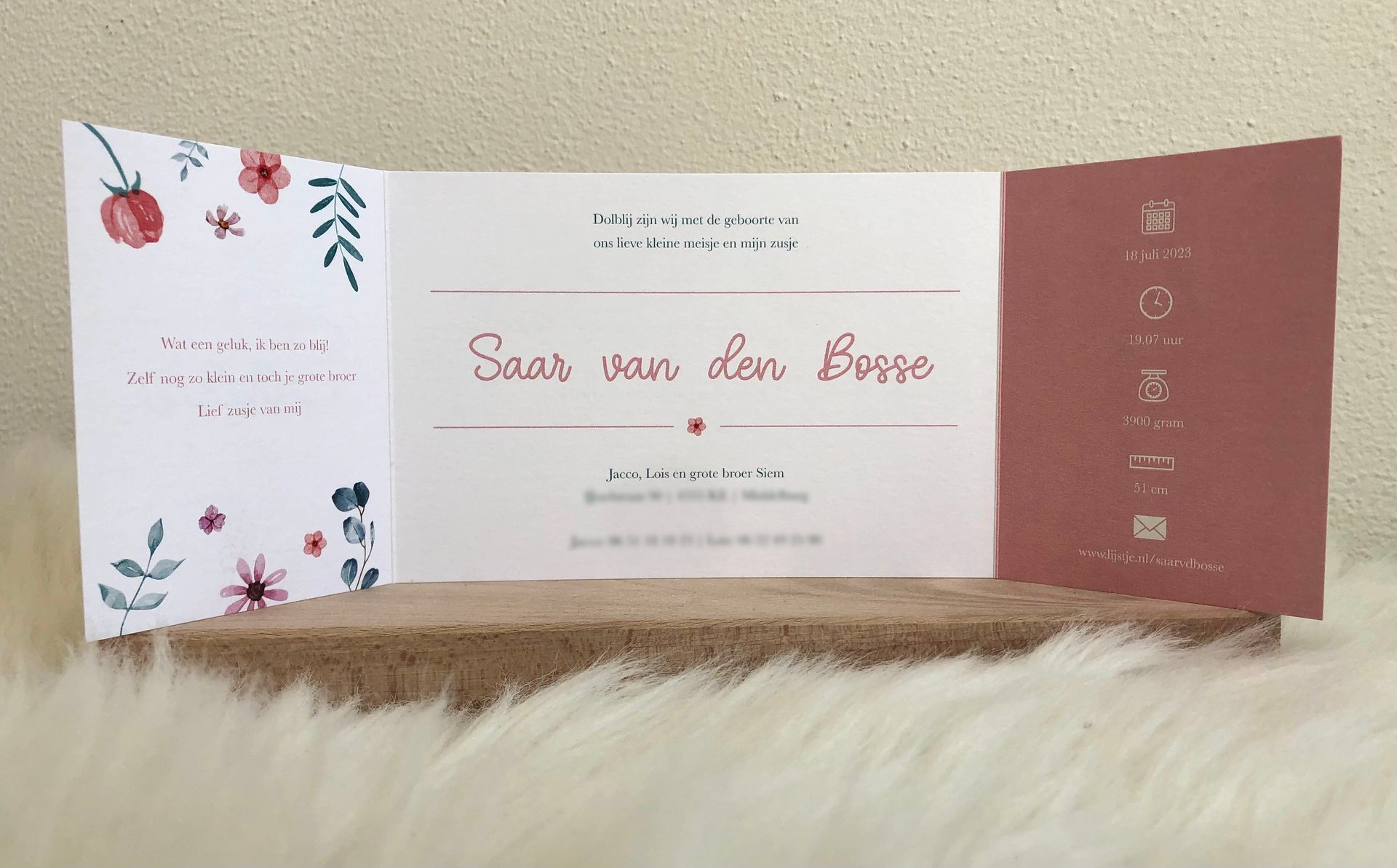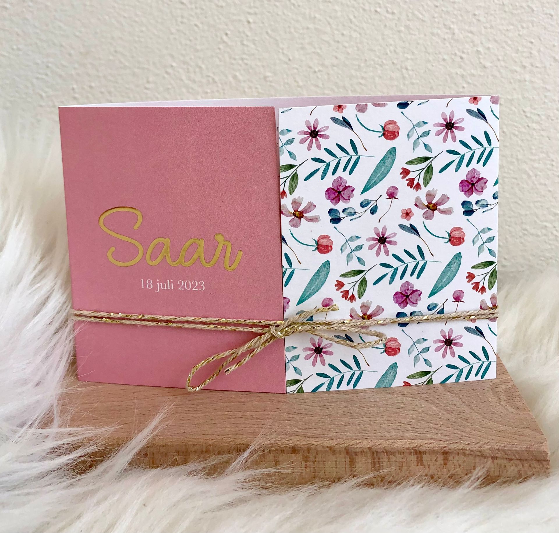 Dit tweeluik met bloemen is speciaal ontworpen voor mijn eigen dochtertje Saar. De naam is prachtig in goudfolie gedrukt en het gouden touwtje voegt een elegante touch toe aan het ontwerp. Binnenin het geboortekaartje zijn de bloemen opnieuw te zien en worden de geboortegegevens op een prominente manier weergegeven.