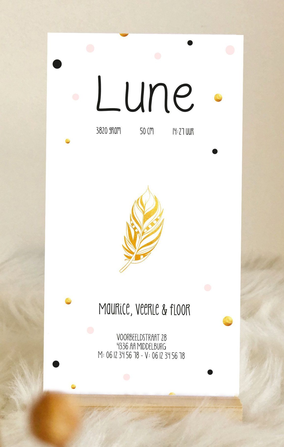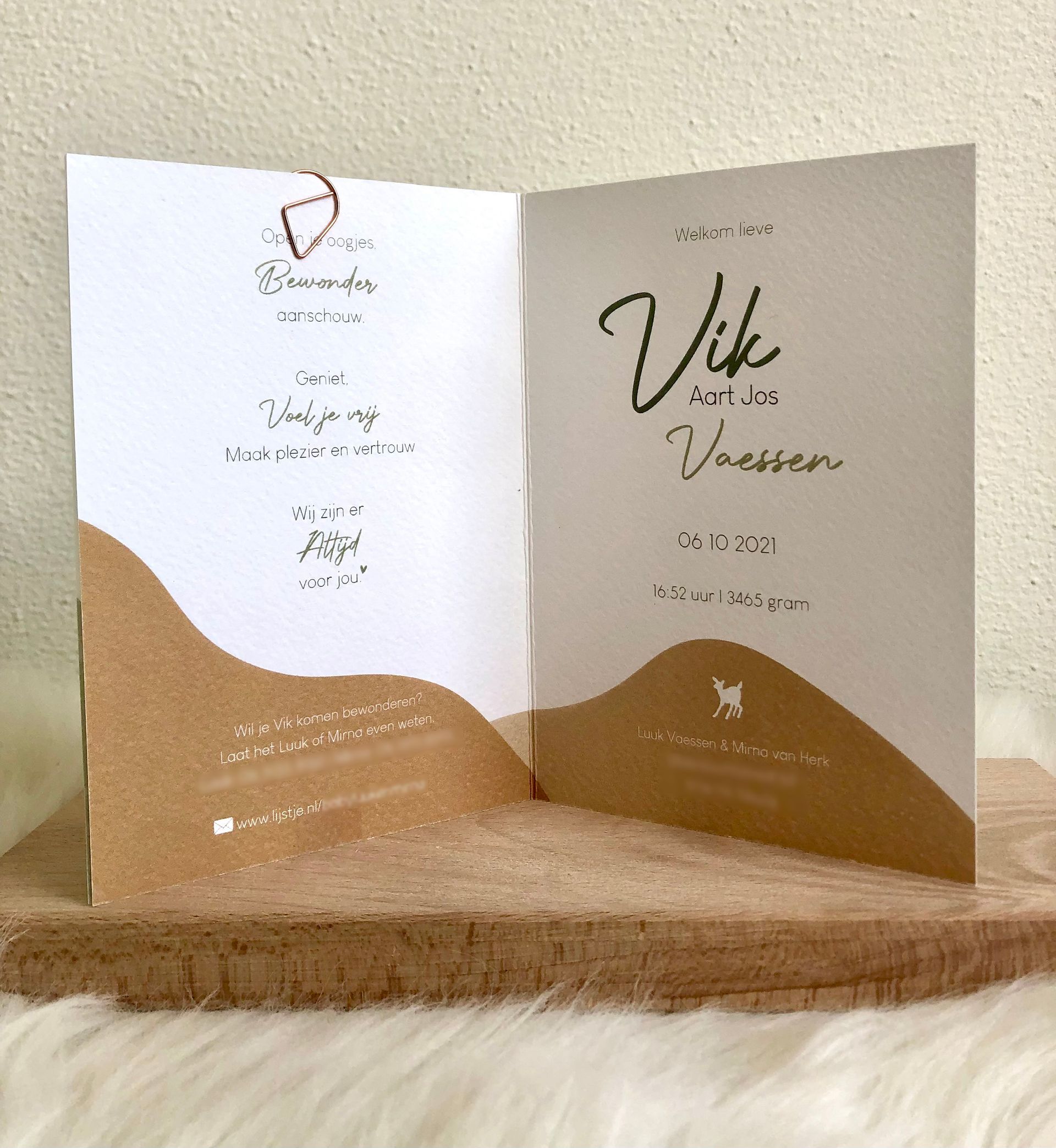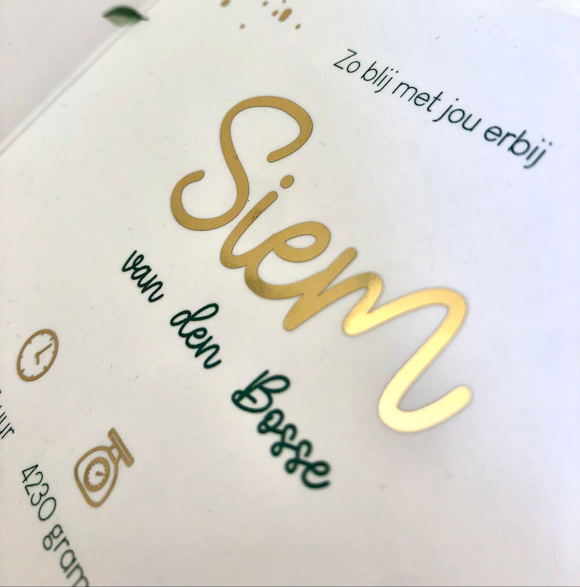 Dit tweeluik met bloemen is speciaal ontworpen voor mijn eigen dochtertje Saar. De naam is prachtig in goudfolie gedrukt en het gouden touwtje voegt een elegante touch toe aan het ontwerp. Binnenin het geboortekaartje zijn de bloemen opnieuw te zien en worden de geboortegegevens op een prominente manier weergegeven.