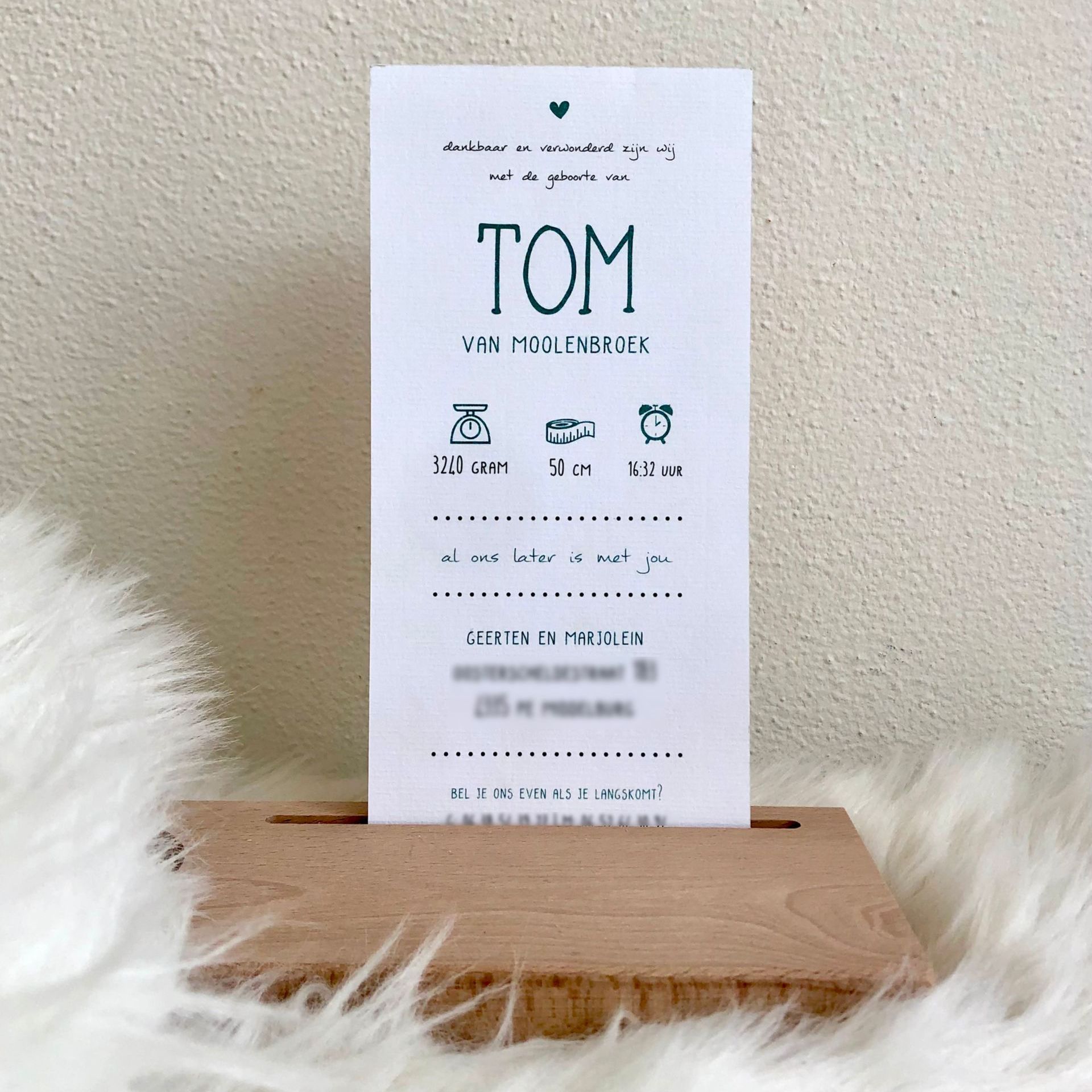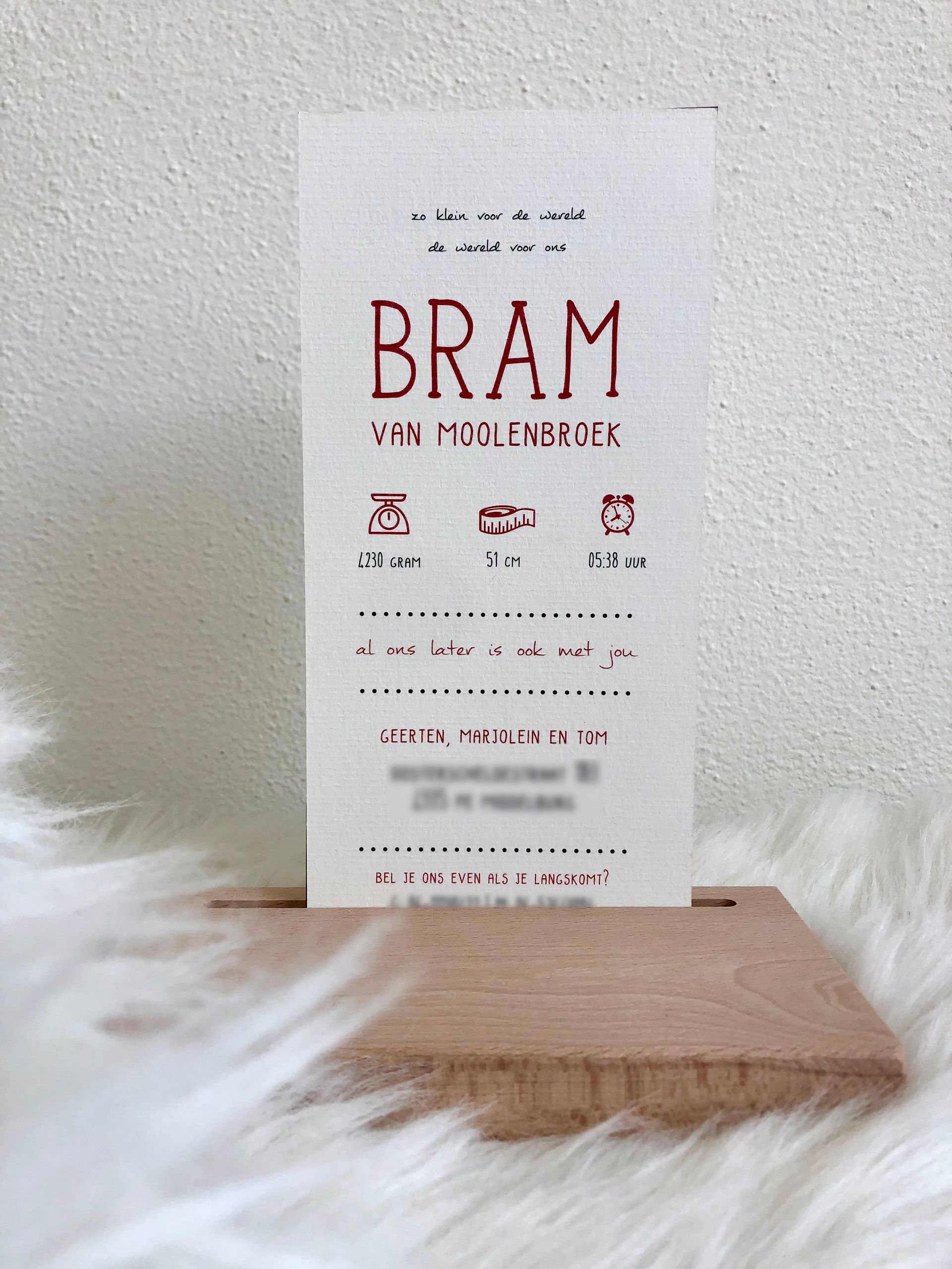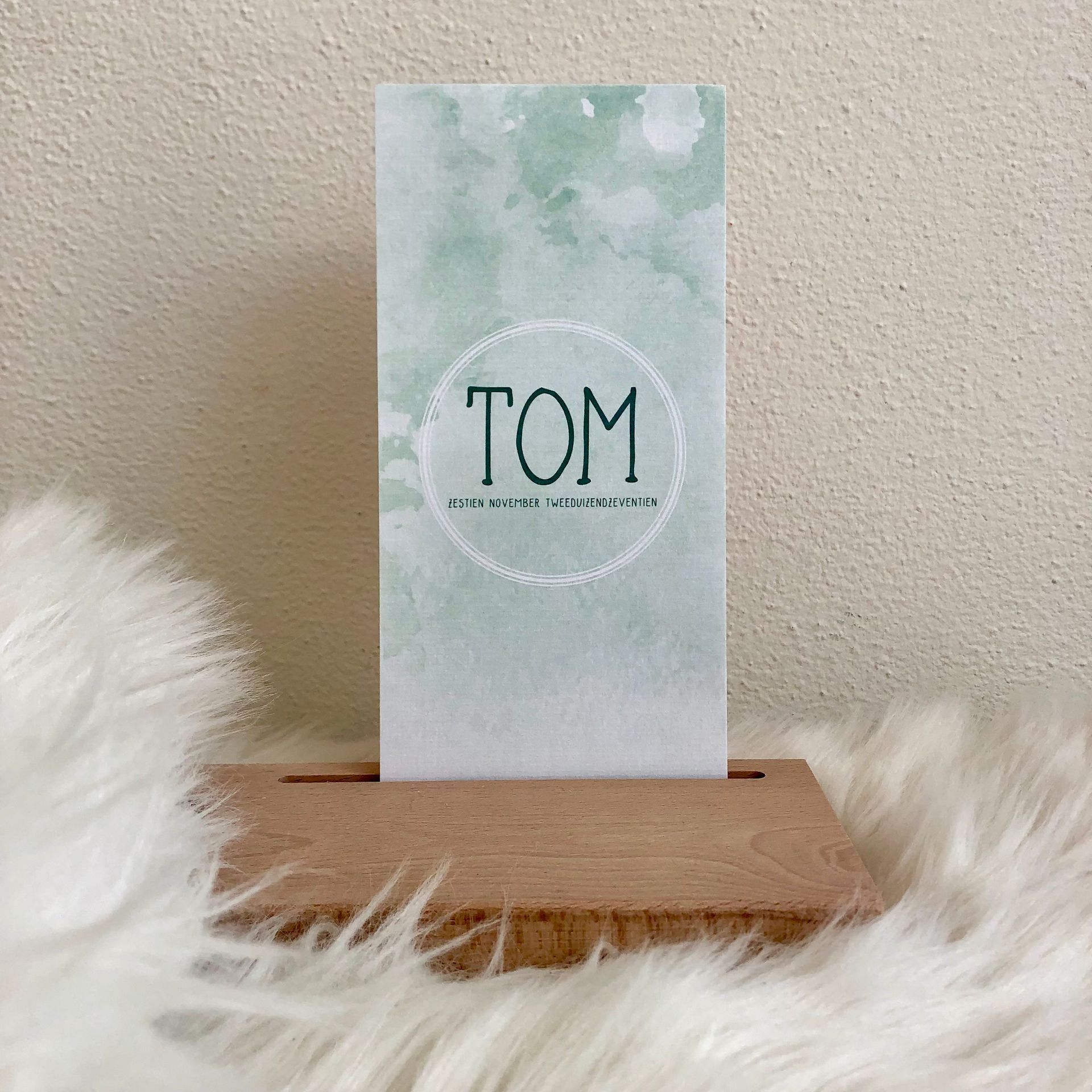 Stijlvol langwerpig geboortekaartje voor een jongen met terrakleurige waterverf. Een prachtige variant op het geboortekaartje van Tom. Superleuk om dezelfde kaart te gebruiken voor het broertje maar dan in een andere kleur, toch net even anders.